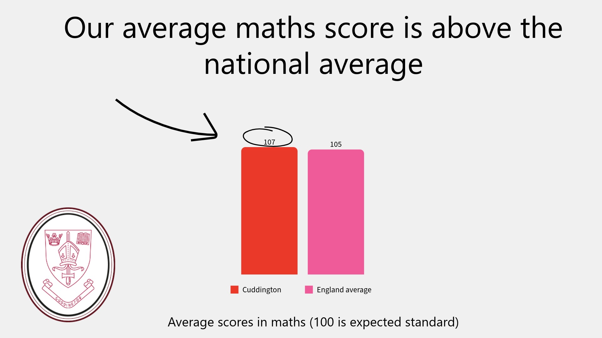 The government expects pupils to reach a score of 100 in reading and maths. At Cuddington the average score in reading was 106 (in line with national average). In maths it was 107 (above the national average).