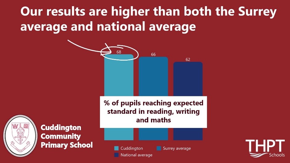 At Cuddington, 68% of pupils met expected standard in reading, writing and maths. This is higher than the national average (62%) and the Surrey average (66%).